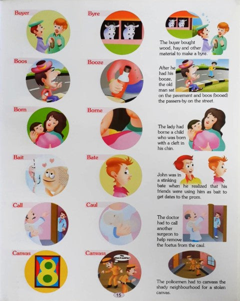 This book studies a lot of pairs of words having the same pronunciation but different meanings, spellings and origins. For examples new and knew are homophones. Each pair of words has been accompanied by relevant pictures and sentences to clarify the difference between the 2 words with same pronunciation. This book helps one to understand the application of homophones which further reflects in the creative writing skills.