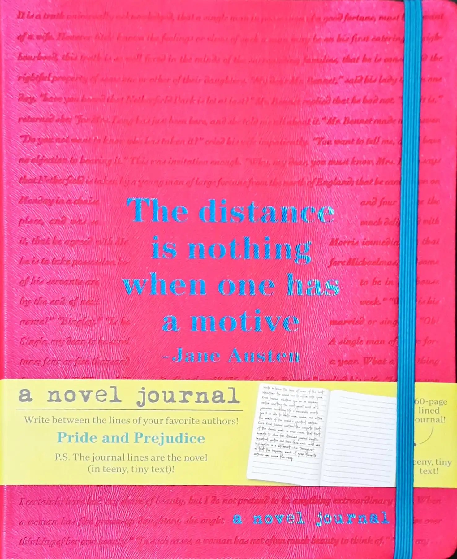 Let Jane Austen's timeless wit inspire your own writing. This elegant journal features the full text of Pride and Prejudice printed in fine lines across each page—perfect for penning your thoughts, stories, or next great novel. With a deluxe cover, patterned endpapers, and an elastic closure, it's an ideal gift for literary lovers and aspiring authors alike.