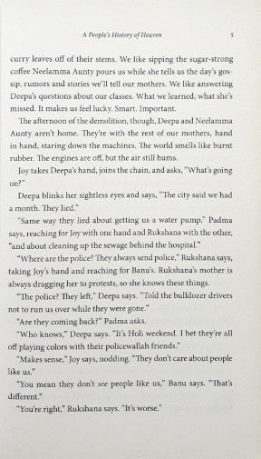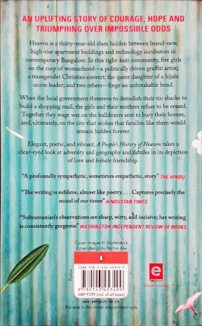 An uplifting story of courage, hope and triumphing over impossible odds. Heaven is a thirty-year-old slum hidden between brand-new, high-rise apartment buildings and technology incubators in contemporary Bangalore. In this tight-knit community, five girls on the cusp of womanhood-a politically driven graffiti artist; a transgender Christian convert; a blind girl who loves to dance; and the queer daughter of a hijabi union leader-forge an unbreakable bond. When the local government threatens to demolish their tin shacks in order to build a shopping mall, the girls and their mothers refuse to be erased. Together they wage war on the bulldozers sent to bury their homes, and, ultimately, on the city that wishes that families like them would remain hidden forever. Elegant, poetic, and vibrant, A People's History of Heaven takes a clear-eyed look at adversity and geography and dazzles in its depiction of love and female friendship.