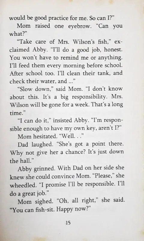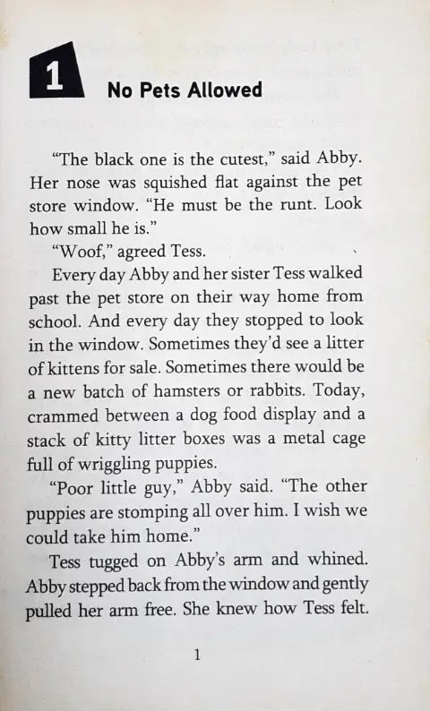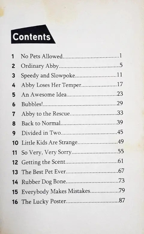 Abby is crazy about animals but her apartment building won't allow pets. So when Abby gets the chance to look after Mrs Wilson's two goldfish, Speedy and Slowpoke, she jumps at it. Now she can show her parents that she's responsible enough to have her own pet sitting business. What could possibly go wrong? For starters, there's Abby's little sister Tess, who's always tagging along. But what really bugs Abby is the way Tess acts like a dog. When Tess gets them both into trouble, Abby has to think fast. Maybe pet sitting isn't going to be as easy as she thought.