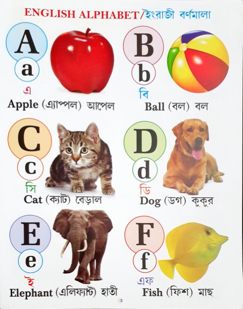 Wonderful book to learn Bangla and English basic alphabets, numbers and various vocabulary words spread across different themes with transliteration and translation