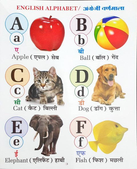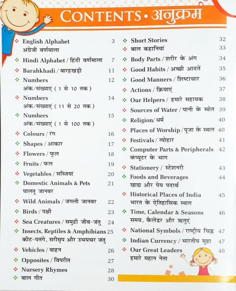 Wonderful book to learn Hindi & English basic alphabets, numbers and various vocabulary words spread across different themes with transliteration and translation
