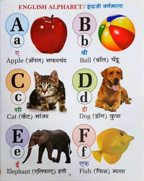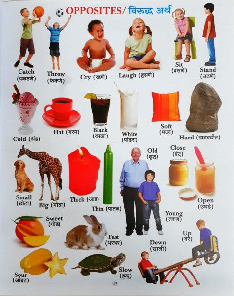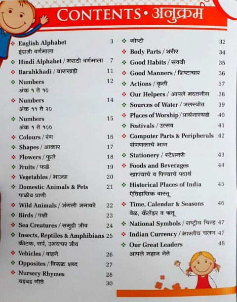 Wonderful book to learn Marathi and English basic alphabets, numbers and various vocabulary words spread across different themes with transliteration and translation