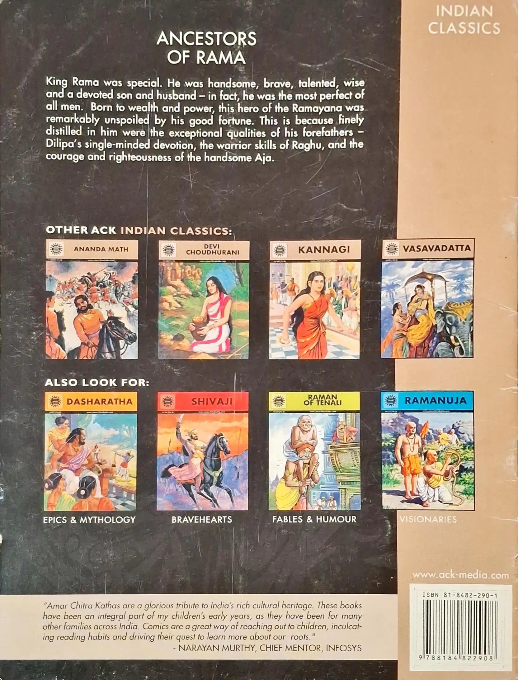 Keywords included: Ancestors of Rama, Amar Chitra Katha, Ramayana stories, Indian mythology, Ikshvaku dynasty, Lord Rama, Dilipa, Raghu, Aja, for ages 6 and above, Indian history comics.
