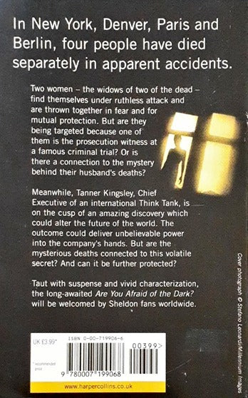In Sidney Sheldon's gripping novel, Are You Afraid of the Dark, a web of mystery and danger unfolds as four individuals meet their untimely deaths in separate locations. The widows of two of the deceased find themselves thrust into a relentless and sinister attack, forcing them to join forces and seek protection. Their lives become intertwined in fear, confusion, and the urgent need to uncover the truth behind the deaths of their husbands.