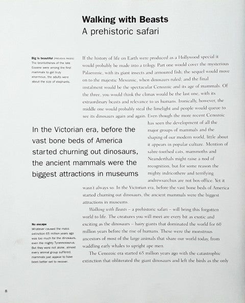 Since the dinosaurs died out over 65 million years ago our planet has been dominated by mammals. A succession of bizarre evolutionary specimens have come and gone -- from walking whales to sabre-toothed cats -- yet many of these magnificent creatures have never been visualized before. Now, for the first time, spectacular and unfamiliar animals are recreated and set in the context of their world. Walking with Prehistoric Beasts reveals the extraordinary ancestors of modern mammals and the arrival of man, bringing to life the roots of our heritage. Following on from the hugely-acclaimed Walking with Dinosuars, Walking with Prehistoric Beasts recreates the creatures and landscapes of post-dinosaur Earth; transporting us to the icy plains of the mammoth, dark forests stalked by giant carnivorous birds, and deserts dominated by 16 ton Indricotheres. From the tiny fruit-eating primate Apidium, to the powerful chalicotheres, whose curved claws forced them to walk on their knuckles, the lives of these little known creatures are vividly brought to life. Meet the bizarre hose-nosed Macrauchenia, and the Deodicurus, a giant armadillo with a spiked club for a tail; run with cat-sized horses and rhino-sized carnivorous pigs, hunt with the skull-crushing Andrewsarchus, and walk with the very first humans. Illustrated boxes describe the latest scientific evidence that led to the reconsturctions of these creatures, while character boxes provide information on behavior and habitats. The text is illustrated throughout with ground-breaking computer graphic images to offer a unique record of lost worlds never seen before and reveal many of the most spectacular periods in Earth's history.