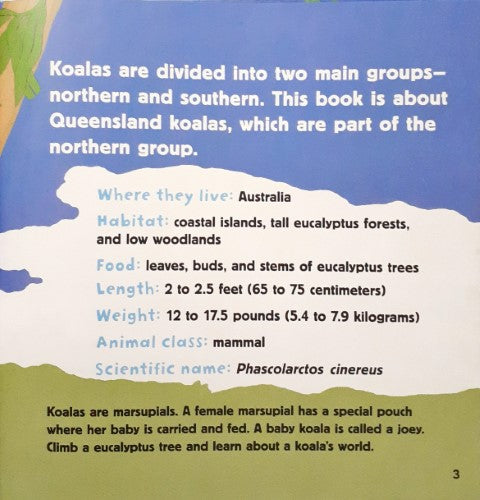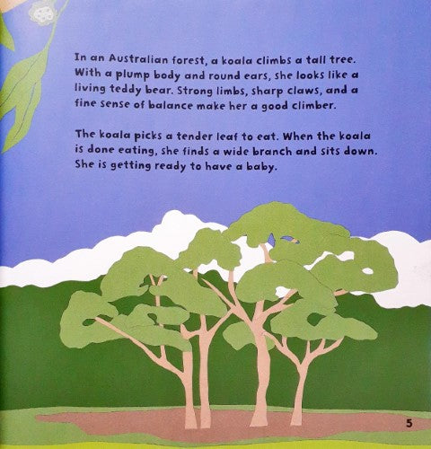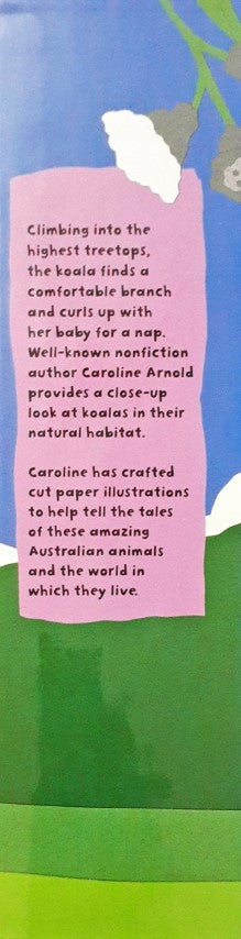 In the treetops of an Australian forest, a baby Koala is born. She quickly crawls into the safety of her mother's pouch. When she's older, the young koala eats leaves and rides on her mother's back. Climb into this book and find out what happens in a Koala's world. Climbing into the highest treetops, the koala finds a comfortable branch and curls up with her baby for a nap. Well known nonfiction author Caroline Arnold provides a close up look at koalas in their natural habitat. Caroline has crafted cut paper illustrations to help tell the tales of these amazing Australian animals and the world in which they live.