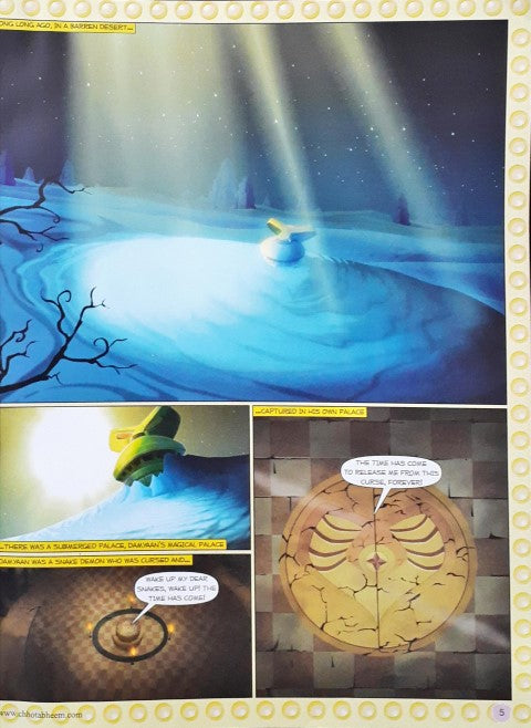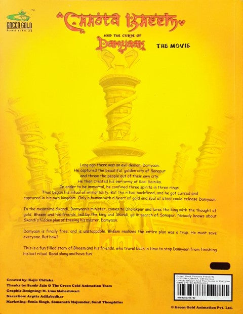 Long ago, there was an evil demon, Damyaan. He captured the beautiful golden city of Sonapur and threw the people out of their own city. He then created his own army of Kaal Sainiks. In order to be immortal, he confined three spirits in three rings. Thus began his ritual of immortality. But the ritual backfired and he got cursed and captured in his own kingdom. Only a human with a heart of gold and soul of steel could release Damyaan. In the meantime, Skandi, Damyaan's minister, comes to Dholakpur and lures the king with the thought of gold. Bheem and his friends led by the king and Skandi, go in search of Sonapur. Nobody knows about Skandi's hidden plan of freeing his master, Damyaan. Damyaan is finally free and is unstoppable. Bheem realizes the entire plan was a trap. He must save everyone. But how? This is a fun filled story of Bheem and his friends who travel back in time to stop Damyaan from finishing his last ritual. Read along and have fun.