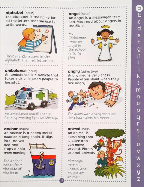 With over 1300 illustrated entries, the perfect book to develop your reading and writing. This colourful easy to use introduction to over 1300 words for young children will help develop key vocabulary skills. Over 1300 everyday words defined. A colourful illustration accompanies each headword. A to Z guide on each page helps children find words quickly. Sample sentences help explain meaning and usage. Part of speech is given for each headword. Special themed pages provide extra word help.