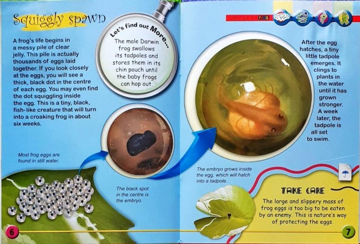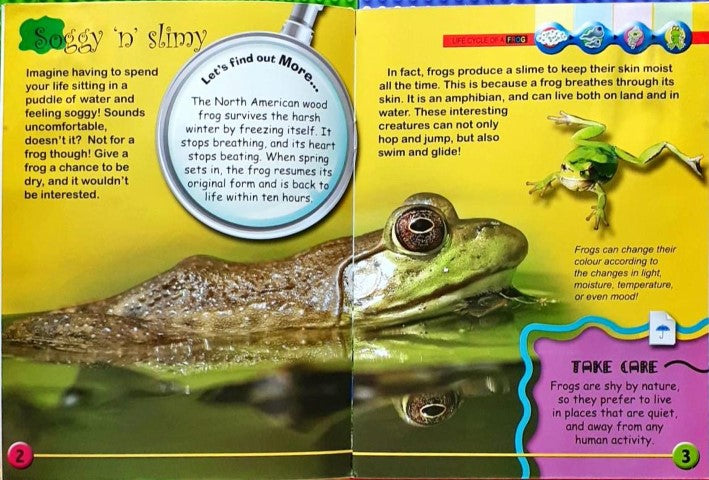 A frog's life begins in a slimy pile of clear jelly. This isactually thousands of eggs laid together. Inside each of these is asquiggly, fish-like creature that will slowly turn into a frog.What is this creature and how does it turn into a frog? This booknot only explains the amazing metamorphosis that takes place in thelife cycle of a frog, it also contains many interesting facts aboutthis curious creature.