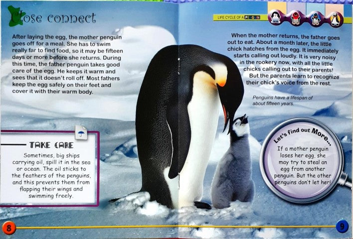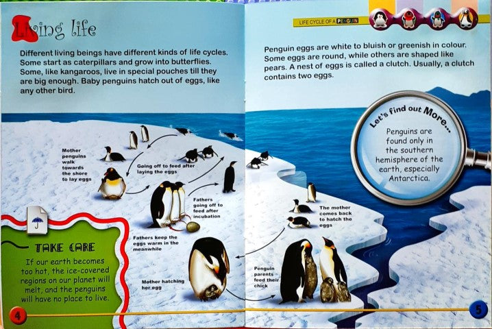 The penguin is one curious bird. It has strange wings, called flippers, but it cannot fly. And though penguins are awesome underwater swimmers, their chicks cannot swim. In fact, they don’t even enter water till they grow up. Then, how do these chicks grow into diving champs who spend long hours in freezing seas? This book not only explains the amazing life cycle of a penguin, it also contains many interesting facts about this wonderful creature.