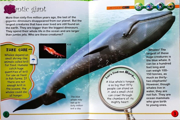 Whales - The largest creatures that ever lived on the planet are bigger than the biggest dinosaurs. Though they live in water, they are not fish. They are ocean mammals that give birth to young ones. But how and where do these creatures give birth? What does the baby feed on? This book not only explains the amazing life cycle of a whale, it also contains many interesting facts about this magnificent creature.