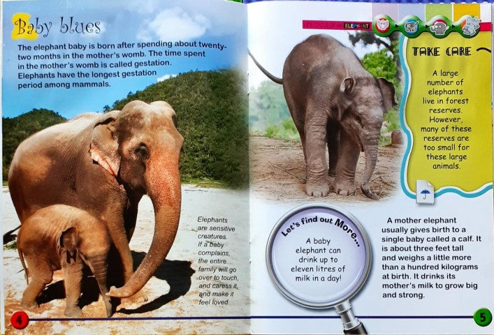 An elephant mother carries her baby for twenty-two months. Afterthe baby is born, the mother feeds it for four years. She also protects and watches over it for another twelve years. Surprised? Meet the gentle giant of the animal kingdom and learn more about how a baby elephant is loved and cared for by its mother, as well as by other elephants in the herd. This book not only explains the amazing life cycle of an elephant, it also contains many interesting facts about this gigantic creature.