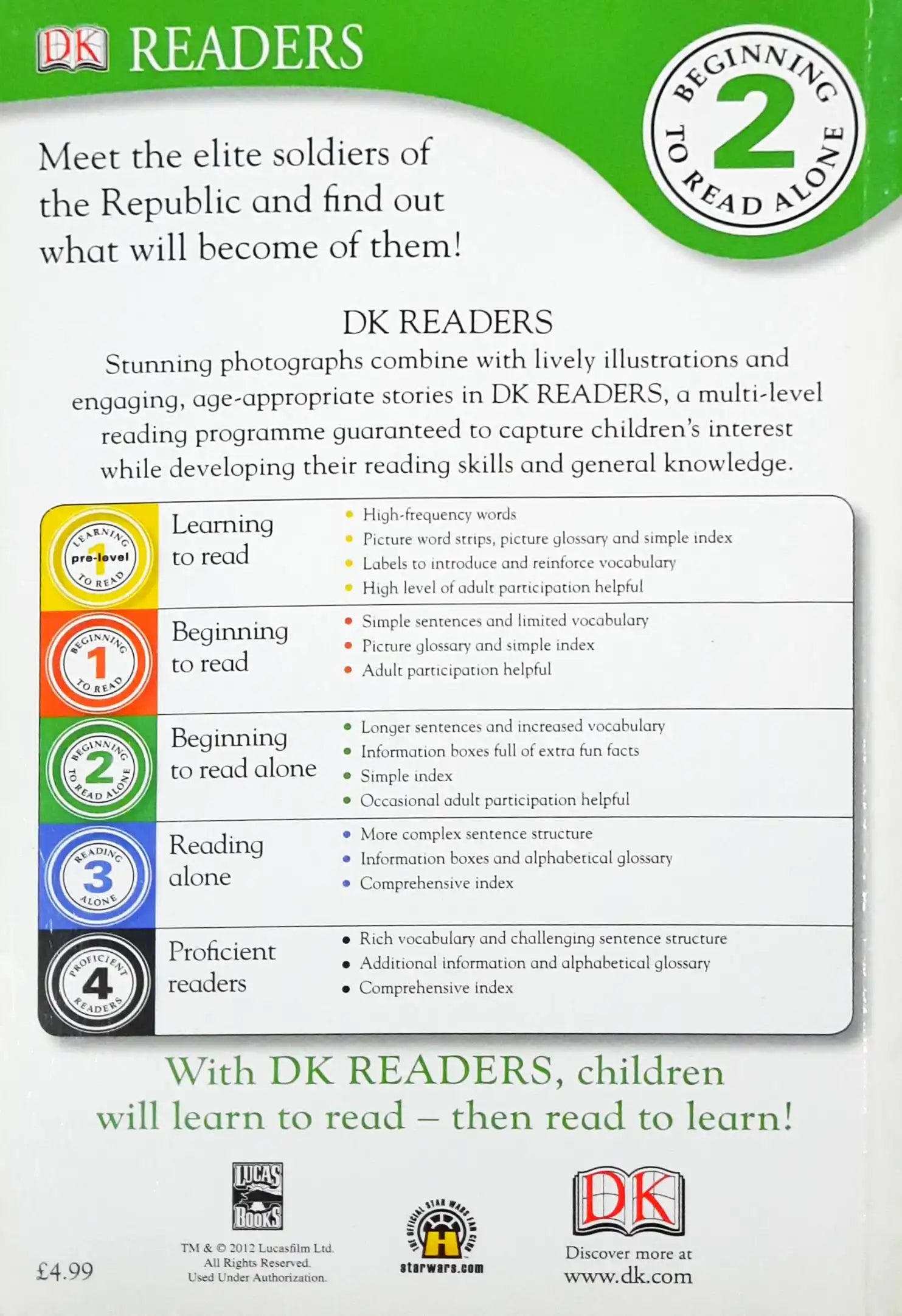 Keywords: Clone Troopers Star Wars book, DK Readers Level 2 Star Wars, Star Wars early reader age 5β7, Galactic Army soldiers book, Star Wars training and battles DK reader, Clone Trooper weapons and armour.