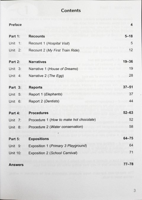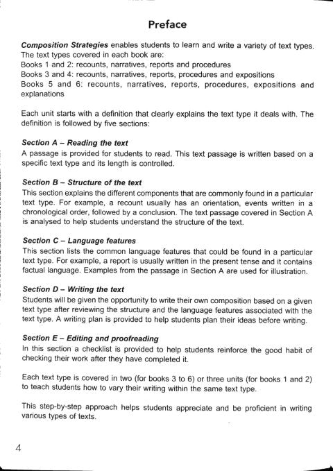 This workbook enables students to learn and write a variety of text types. Different passages are provided for each text type to teach students how to vary their writing within the same text type. This step by step approach helps students to be proficient in writing.