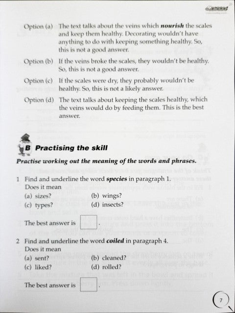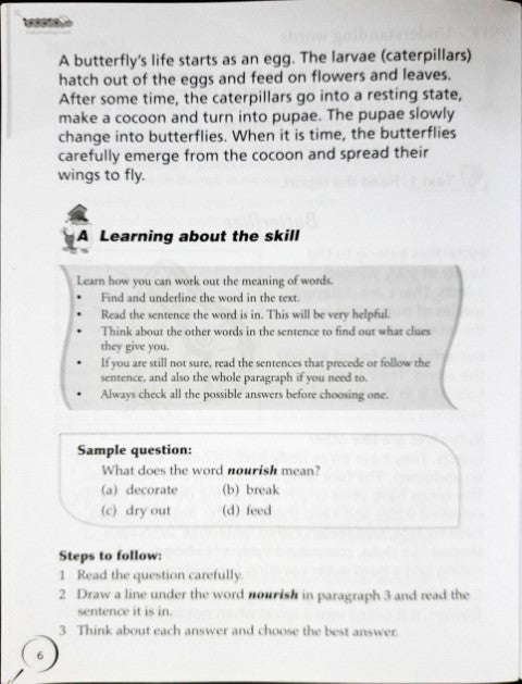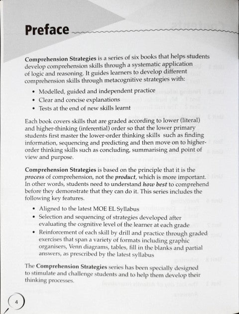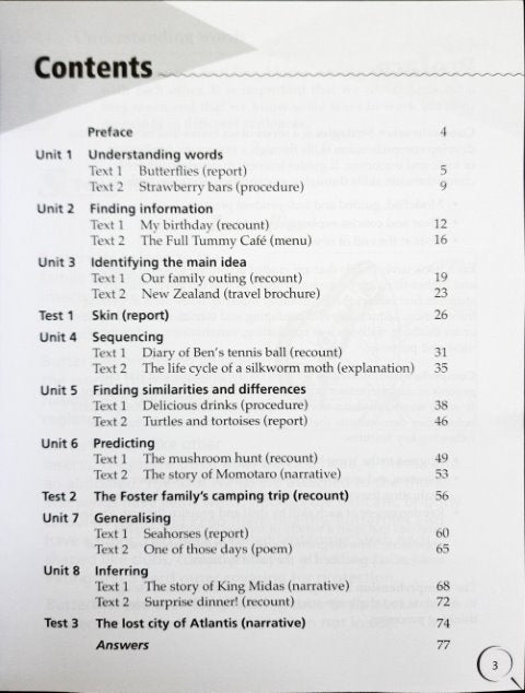 This workbook teaches key skills like understanding words, finding information, identifying the main idea, sequencing, predicting and inferring.