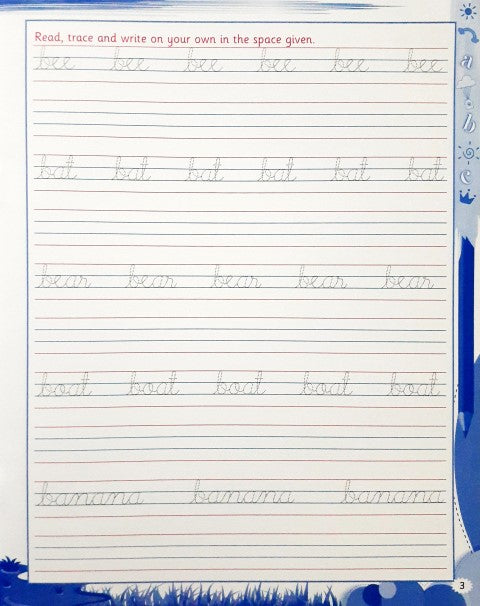 Learn spellings along with writing practice, effective in increasing the speed of writing, theme based words and sentence writing exercises. New research findings conclude that handwriting is linked to improved reading skills and vocabulary. Learn how to make connections between letters and write words and sentences clearly. This workbook gives children ample space to learn to write on lines using proper spacing between letters and words. Builds ability to write using continuous strokes, plenty of tracing work and self evaluating independent exercises, learn important concepts such as Safety Rules, Shapes, Plants, Fruis and Vegetables.