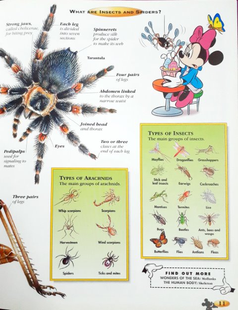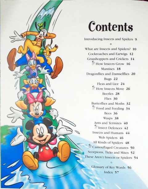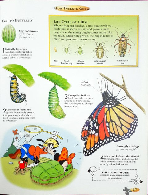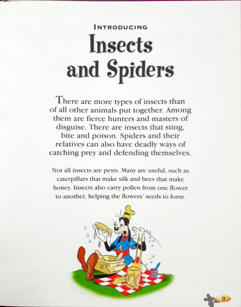 Mickey, Minnie, Donald, Daisy, Goofy and Pluto are ready to take you on an adventure ride through the world of learning. Discover the secrets of science, nature, our world, the past and much more. Climb aboard and enjoy the ride. There are more types of insects than of all other animals put together. Among them are fierce hunters and masters of disguise. There are insects that sting, bite and poison. Spiders and their relatives can also have deadly ways of catching prey and defending themselves. Not all insects are pests. Many are useful such as caterpillars that make silk and bees that make honey. Insects also carry pollen from one flower to another helping the flowers' seeds to form.