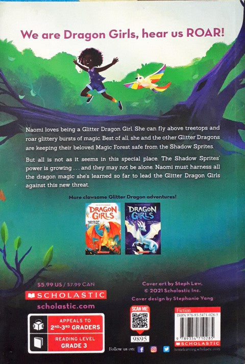But when Naomi discovers that the Shadow Sprites' power is growing, she realizes that their threat may not be the only one the Glitter Dragon Girls will have to face. With the fate of the Magic Forest hanging in the balance, Naomi must use all the dragon magic she has learned to lead her fellow Glitter Dragons in a battle against this new, unknown enemy. Join Naomi and the Dragon Girls as they rise to the challenge and prove that girls can be fierce, magical, and unstoppable!