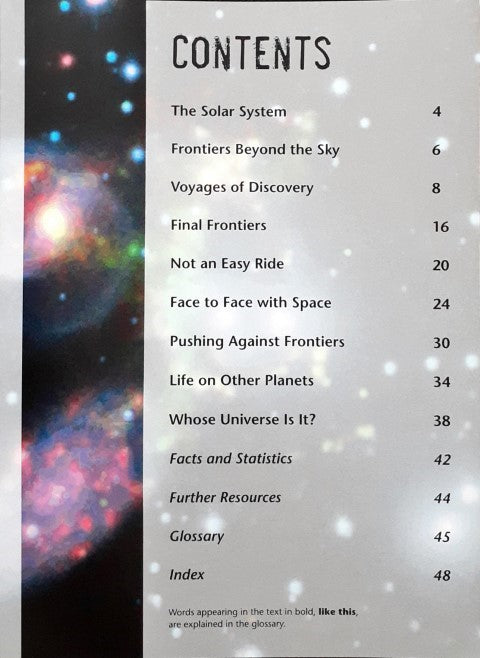 Provides an overview of outer space, describing the planets, satellites, and other objects in the solar system, and discusses such topics as manned and unmanned space exploration, living and working in space, and life on other planets.