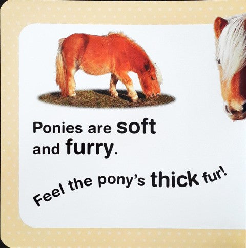 This charming book is the ideal way to introduce your child to the adorable world of ponies. It features captivating photographs, simple words that are easy to share with your child, and five unique textures that little hands will love to touch and explore. With this delightful book, your child will embark on an exciting journey through the fascinating world of ponies.