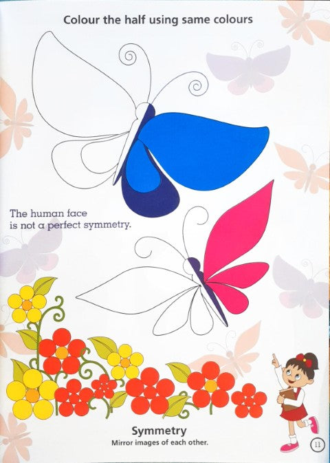 Skills include Visual Skills, Symmetry, Tripod Grasp, Coordination, Eye Hand Fluency, Tracing Skills, Directionality. Activities that develop children's fine motor skills primarily fine motor coordination, eye hand coordination and understanding directionality, allow them to make the precise movements necessary for forming letters. Every child will acquire the fine motor skills needed for handwriting in a different timetable. The more preschool children use their fingers and eyes in activities that help to strengthen their coordination, the sooner they will master these skills. Young children from 3 to 5 years of age use their hands and eyes to explore and learn about the environment and themselves. By developing good visual skills and fine motor skills you will prepare them for the next step which is writing. In this book, children will do various activities like tracing, palm printing, handle crayons, use paint, colour images, matching, complete mazes, join the dots, find the differences, complete the patterns, understand symmetry, eye hand coordination, directionality and many more. Children's ability to do these simple pages as part of the prewriting process froms the building blocks for formal writing of letters, words and numbers. These activity pages are sequentially arranged so as to help in the various skills needed for writing. At the bottom of each page, you will be able to identify the skill that is being enhanced. Take time to read the skill and help your child attempt the activity on the page keeping the skill in mind. Understand and enjoy the development of your child's handwriting process.