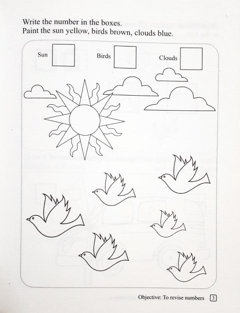 This book include the skills - reinforces the concept of 1-10 in ascending and descending order, identifies numbers on the number line and to learn to count with the help of number line, learns to use Tens and Ones, teaches the concept of place value, teaches to count and to relate to the written number, recognizes 3 dimensional shapes, reinforces the concept of ordinal and cardinal numbers, reinforces the concept of Even and Odd numbers, teaches to count in 5s and 10s, introduces the concept of Heavy and Light, teaches to count in serial order and to recall numbers from number names and to write numbers 1-20