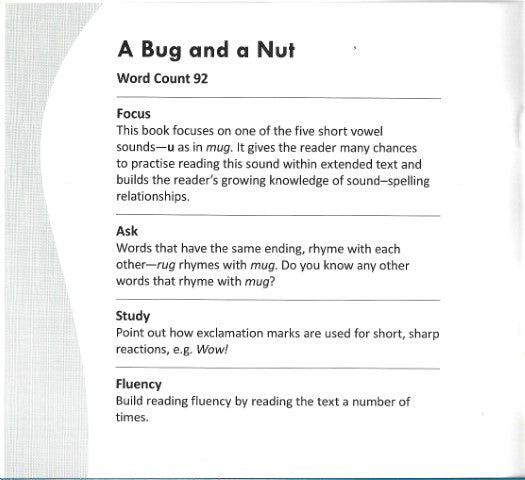 This book focuses on one of the five short vowel sounds - u as in mug. It gives the reader many chances to practice reading this sound within extended text and builds the reader's growing knowledge of sound spelling relationships.