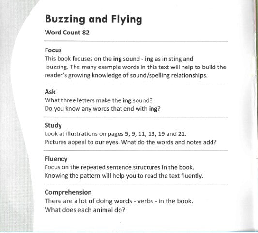 This book focuses on the ing sound - ing as in sting and buzzing. The many examples in this text will help to build the reader's growing knowledge of sound spelling relationships.