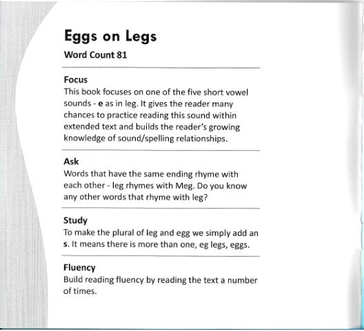 This book focuses on one of the five short vowel sounds - e as in leg. It gives the reader many chances to practice reading this sound within extended text and builds the reader's growing knowledge of sound spelling relationships.