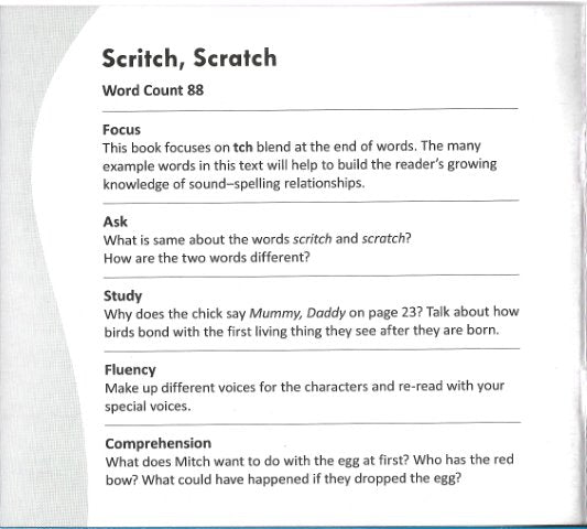 This book focuses on tch blend at the end of words. The many example words in this text will help to build the reader's growing knowledge of sound spelling relationships.