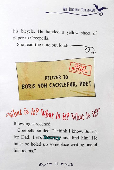 In the spine-chilling world of Gloomeria, Creepella's father, Boris von Cacklefur, finds himself on the cusp of Fright Night glory. As a finalist in the renowned poetry competition, Fright Night Idol, Boris must deliver bone-chilling verses to secure the coveted title. However, when Boris vanishes mysteriously during the contest, it's up to Creepella and her loyal companions to embark on a daring search. Will they unravel the enigma and locate Boris before the climactic final round? Join Creepella on this fur-raising journey filled with suspense and surprises!