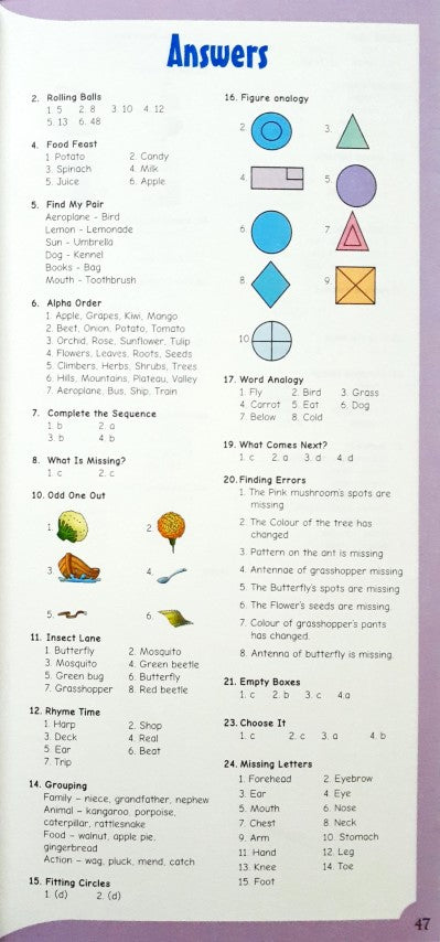 Word Games, Puzzles, Patterns and fun activities to keep the child engrossed for hours, basically learning with fun. Answers provided
