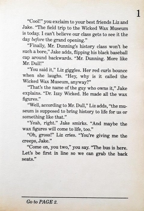 Reader experiences the adventures of visiting a wax museum, where things are not what they seem. Use the clues and decide your own fate.