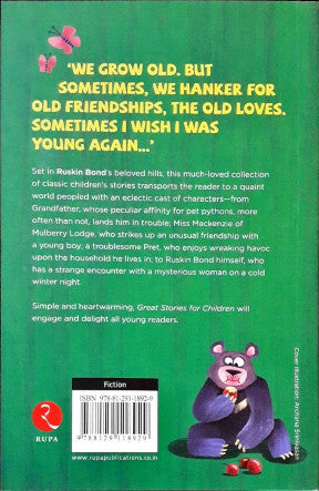 Great Stories for Children is a potpourri of 19 short stories that effectively transports the reader to the fascinating world of its endearing characters. The ensemble includes Tutu the monkey who is fond of troubling the no-nonsense Aunt Ruby, a pet python who makes sudden appearances at the most unusual places, a troublesome Pret who enjoys stirring up the household he resides in, three young children stranded on the Haunted Hill, Himalayan bears who feast on pumpkins, plums and apricots, a crafty thief who has a change of heart, and Ruskin Bond himself who meets a ghost at a resort in the middle of the night ...