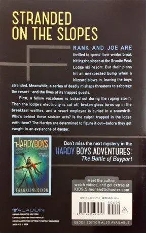 First, a fellow vacationer nearly freezes solid when he’s locked out during the raging storm. Then, the lodge’s electricity is cut off, broken glass turns up in the breakfast waffles, and a resort employee is buried in a snowdrift. Who’s behind these sinister acts? Is the culprit trapped in the lodge with them? The Hardys are determined to find out—before they’re caught in an avalanche of danger.