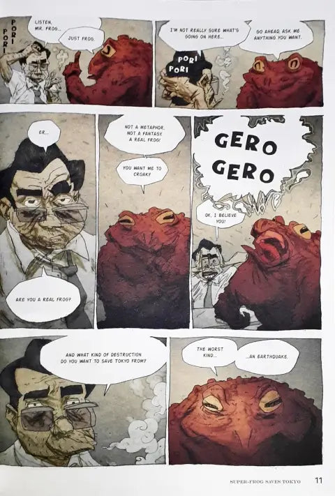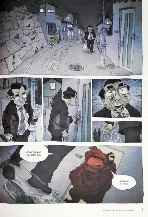 “Super-Frog Saves Tokyo”: In the aftermath of an earthquake, Katagiri discovers a giant frog in his home. The frog pledges to save Tokyo from another quake, but Katagiri must assist. Is it reality, or is Katagiri caught in a dream? The story unfolds with an engaging mix of realism and fantasy, revealing poignant undertones about Katagiri's solitary life and his apprehension of another quake.
