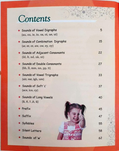 This is an excellent workbook to understand the concept of vowel digraphs, combination digraphs, adjacent consonants, double consonants, vowel trigraphs, soft sounds, long vowel sounds, prefix, suffix, syllables, silent letters and consonant sound