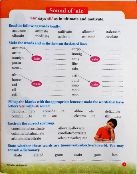 It's a step by step approach to learn the complete phonics, multiple exercises/activities on 2 letter, 3 letter, 4 letter & 5 letter sounds with word families. It also includes suffix, silent letters, homophones, syllables & sight words