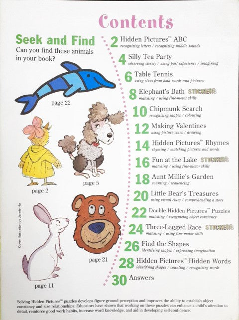This book helps to build and test these skills - recognizing letters and middle sounds, imagination & observation, matching using fine motor skills, recognizing shapes & sequencing, colouring using picture & word clues, expressing imagination, counting, comprehending a story using visual clues, recognizing object constancy, identifying shapes and drawing from observation, recognizing words
