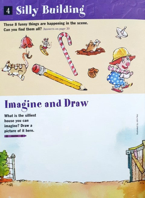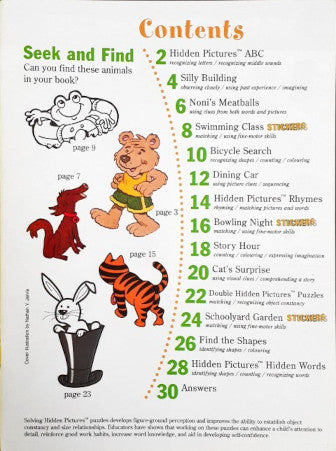 This book helps to build and test these skills - recognizing letters and middle sounds, imagination & observation, matching using fine motor skills, recognizing shapes & sequencing, colouring using picture & word clues, expressing imagination, counting, comprehending a story using visual clues, recognizing object constancy, identifying shapes and drawing from observation, recognizing words