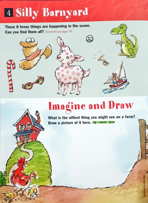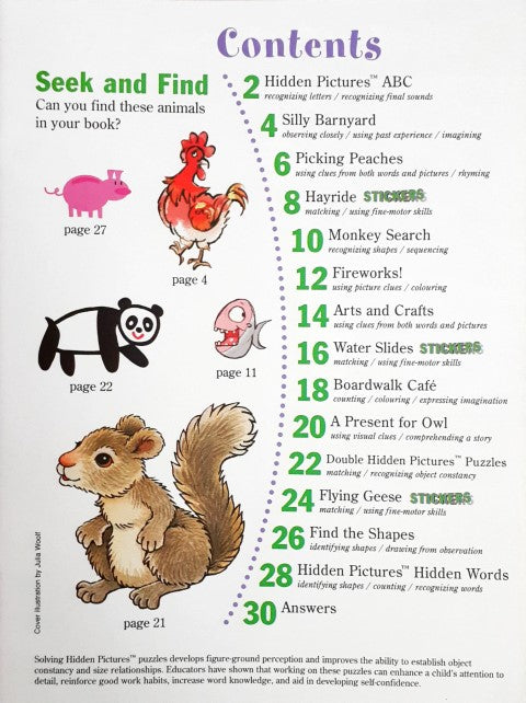 This book helps to build and test these skills - recognizing letters and middle sounds, imagination & observation, matching using fine motor skills, recognizing shapes & sequencing, colouring using picture & word clues, expressing imagination, counting, comprehending a story using visual clues, recognizing object constancy, identifying shapes and drawing from observation, recognizing words