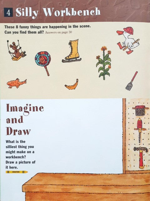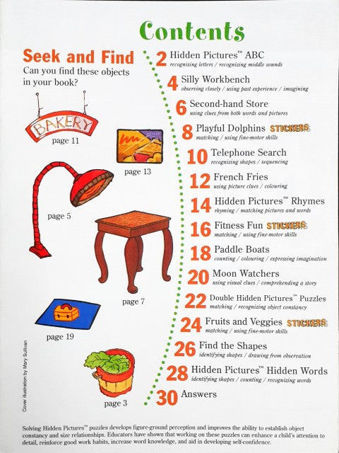 This book helps to build and test these skills - recognizing letters and middle sounds, imagination & observation, matching using fine motor skills, recognizing shapes & sequencing, colouring using picture & word clues, expressing imagination, counting, comprehending a story using visual clues, recognizing object constancy, identifying shapes and drawing from observation, recognizing words