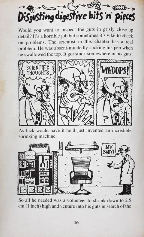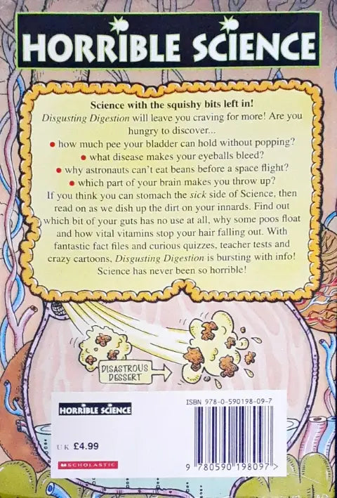 Disgusting Digestion will leave you craving for more. Are you hungry to discover. If you think you can stomach the sick side of Science then read on as we dish up the dirt on your innards. Find out which bit of your guts has no use at all, why some poos float and how vital vitamins stop your hair falling out. With fantastic fact files and curious quizzes, teacher tests and crazy cartoons, this book is bursting with info. Science has never been so horrible.
