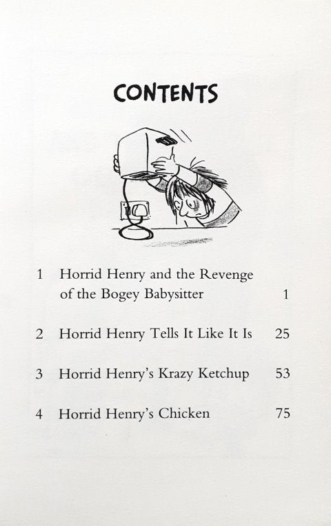 Four brand new stories in which you can discover the one thing Horrid Henry is scared of, watch out for the return of Rabid Rebecca, find out what happens when Henry makes a film about his family and lots more. Contains four stories: