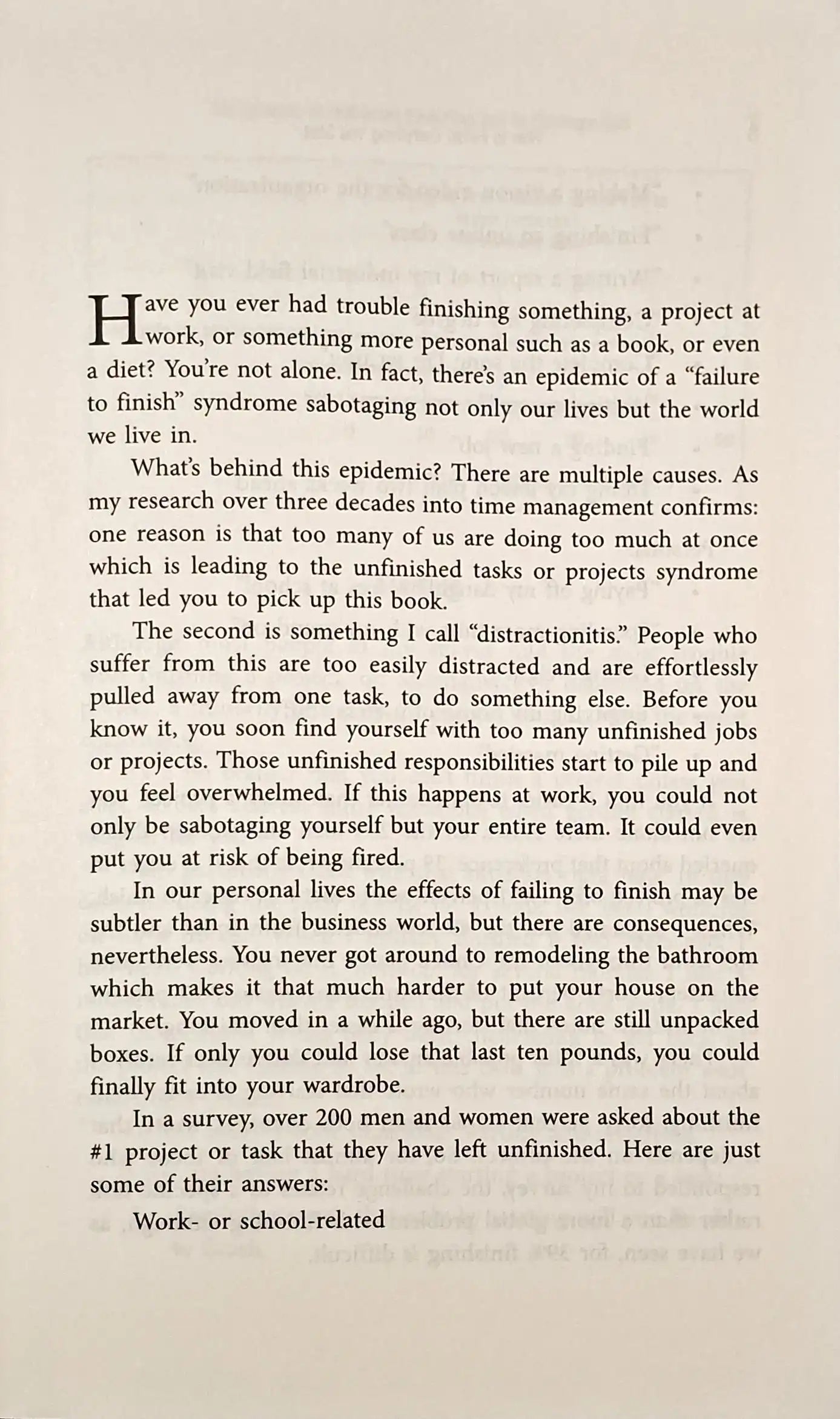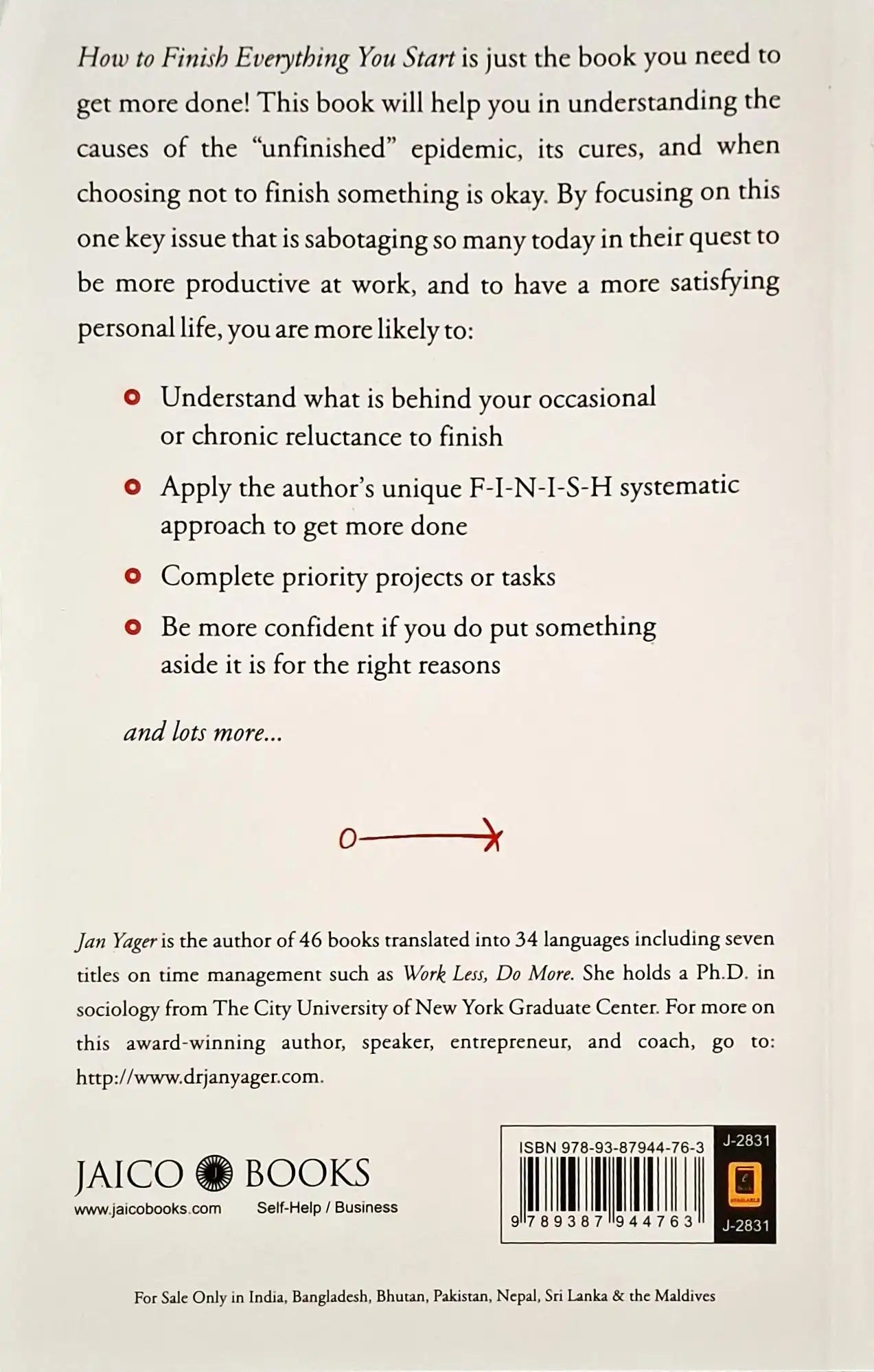 In this insightful book, productivity expert Jan Yager explores the real reasons behind the modern βunfinished epidemicβ and shows how it quietly sabotages success, confidence, and satisfaction in both work and personal life. With clarity and compassion, she explains why procrastination, overload, fear, and misplaced priorities keep us from finishingβand when itβs actually okay to let something go.