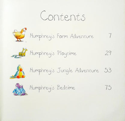 Join Humphrey and his friends in 4 adorable stories in this padded hardcover book. Visit the farm, explore Humphrey's toy box, play in Humphrey's make believe jungle and then get ready for bed. A beautiful treasury, perfect for young children.