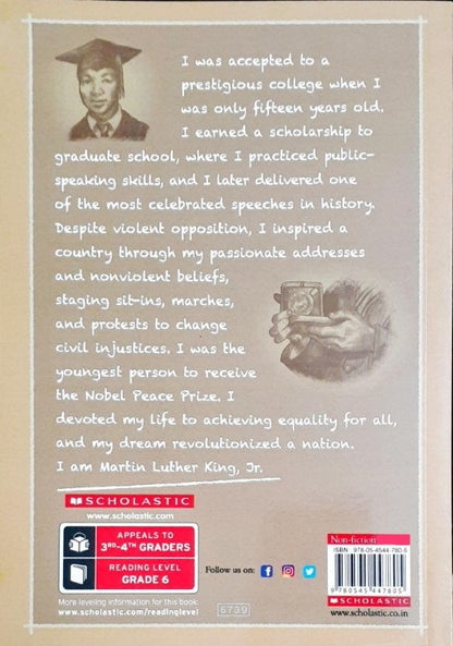 I was accepted to a prestigious college when I was only 15 years old. I earned a scholarship to graduate school where I practiced public speaking skills and I later delivered one of the most celebrated speeches in history. Despite violent opposition, I inspired a country through my passionate addresses and nonviolent beliefs, staging sit-ins, marches and protests to change civil injustices. I was the youngest person to receive the Nobel Peace Prize. I devoted my life to achieving equality for all and my dream revolutionized a nation. I am Martin Luther King Junior.