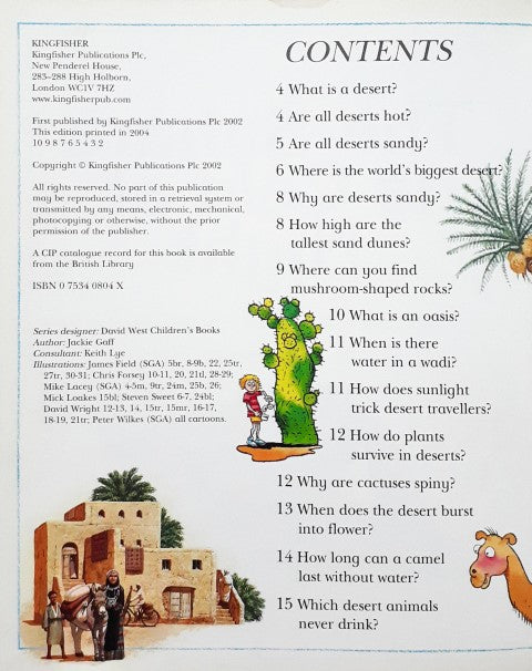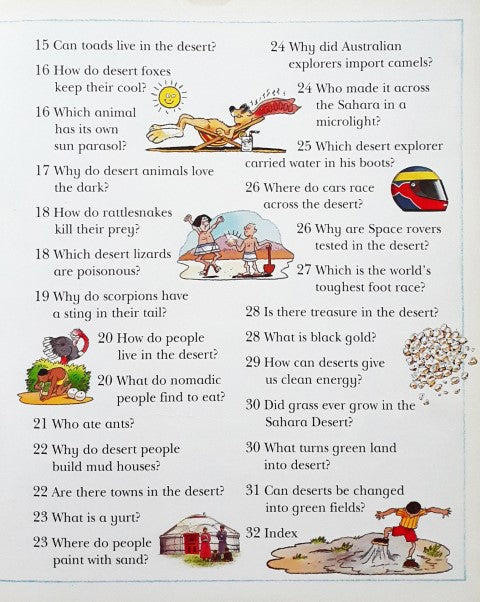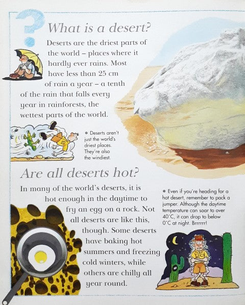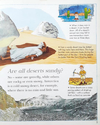 The bestselling I Wonder Why series answers demanding questions in an unrivalled child friendly and informative style, guaranteed to arouse the reader's curiosity and develop reading skills. Designed to amuse and intrigue the young reader, this addition to the I Wonder Why series answers many of the questions that children ask about deserts including: Are all deserts sandy, Why are cactuses spiny?, and Is there treasure in the desert?