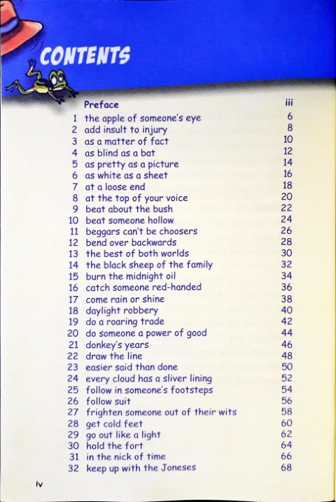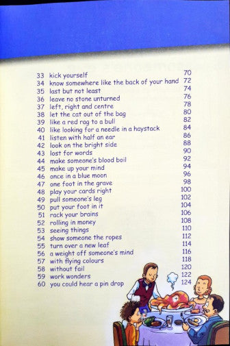 Each idiom is clearly explained with a definition, example sentences and a humorous contextual cartoon in plain everyday English
